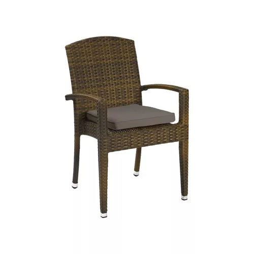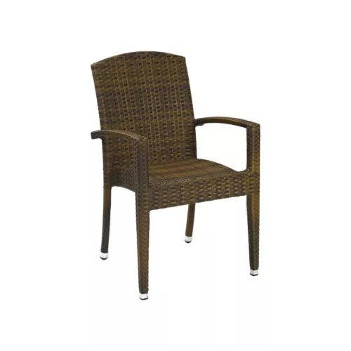 Titus Brown A is a robust outdoor chair with armrests, featuring a powdercoated aluminium frame and a flat P.E.-Wicker seat and backrest in a warm burned color. UV and weather resistance ensure long-term performance. Stackable up to 8 pieces, it fits seamlessly into any outdoor horeca setting. An optional water-repellent seat cushion is available for added comfort.