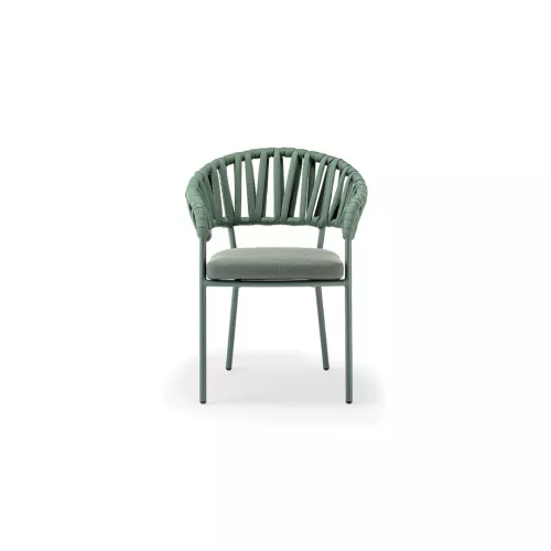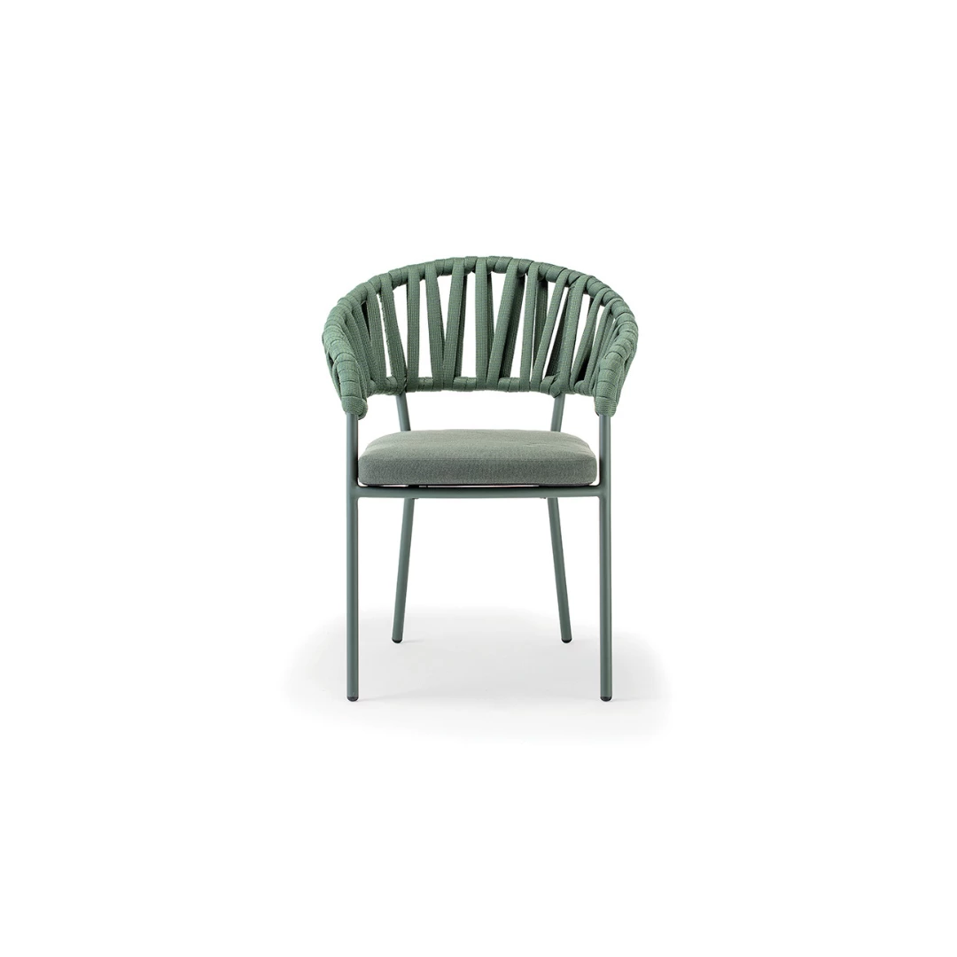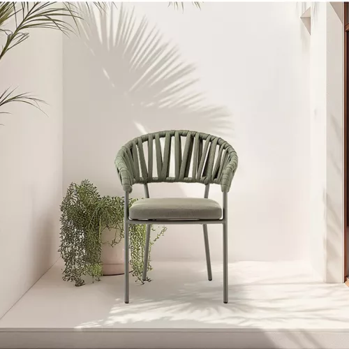 Victory is a stackable outdoor armchair with an aluminium frame, elegantly wrapped in durable acrylic rope. It includes a seat cushion upholstered in water-repellent Olefin fabric, offering long-lasting comfort. Designed for horeca terraces, it brings both function and sophisticated design to any outdoor space.