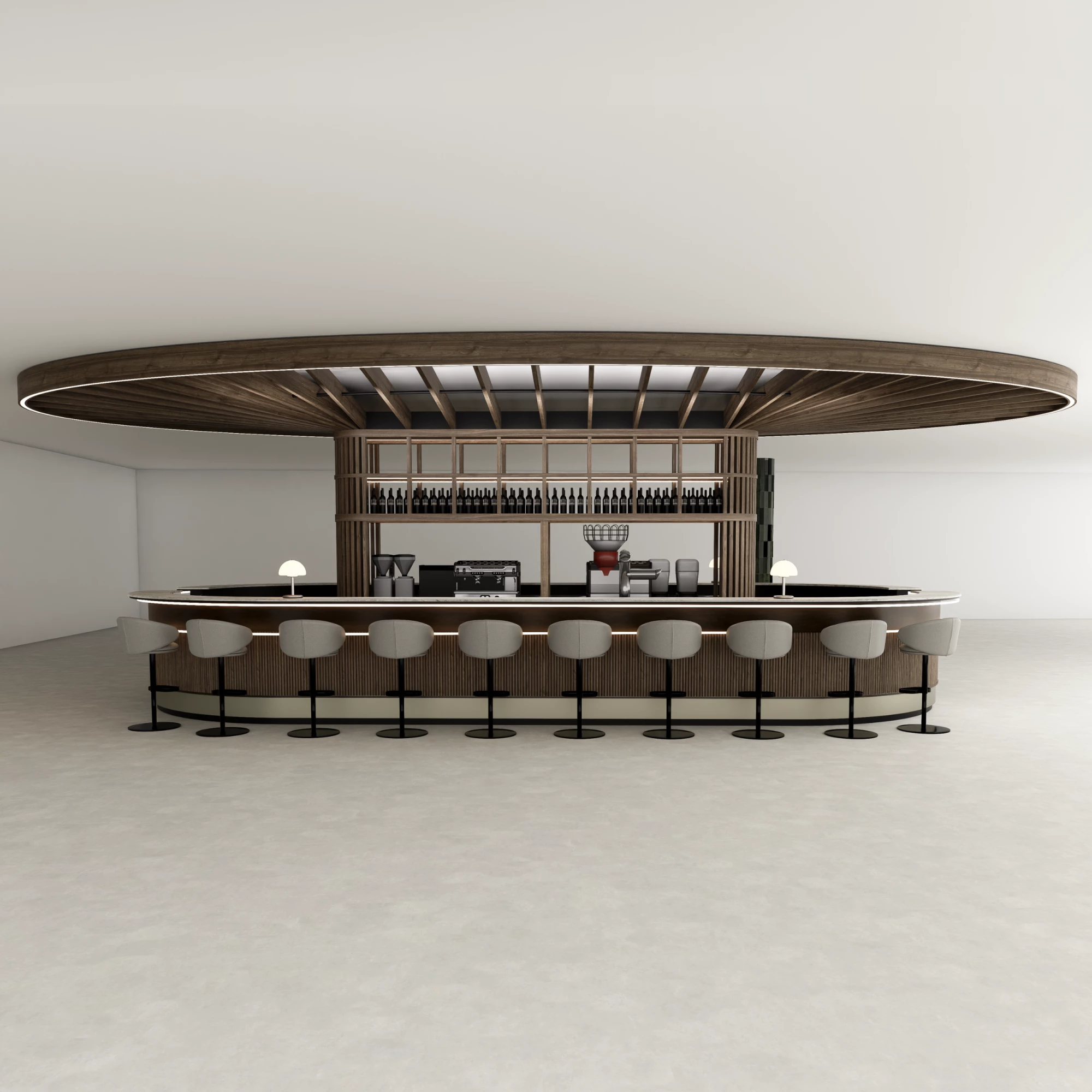 A custom-made contemporary modern bar concept designed exclusively for indoor café and restaurant environments. Its presence feels warm, refined, and quietly luxurious. The design is fully supported with 3D available, offering a precise visualisation of the final concept.