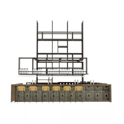The hanging frame and backwall frame are crafted from 4x4 cm metal profiles, powder coated black, with integrated hooks for wine glasses. Side panels feature a metal mesh finish, adding industrial elegance and subtle transparency. Shelves in veneer wood-look HPL echo the service top, completing a cohesive and tactile material palette.