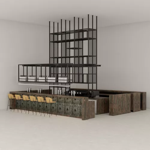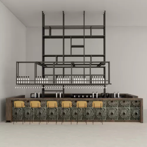 A bar designed for modern hospitality spaces, merging warmth, metallic sophistication, and architectural style into a refined centerpiece.